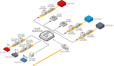 - 服务整合器(App):负责服务的整合和编排,对Source模块接入的聚合服务,进行服务编排,并通过Sink模块接入要编排的服务。